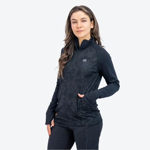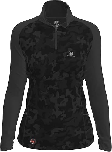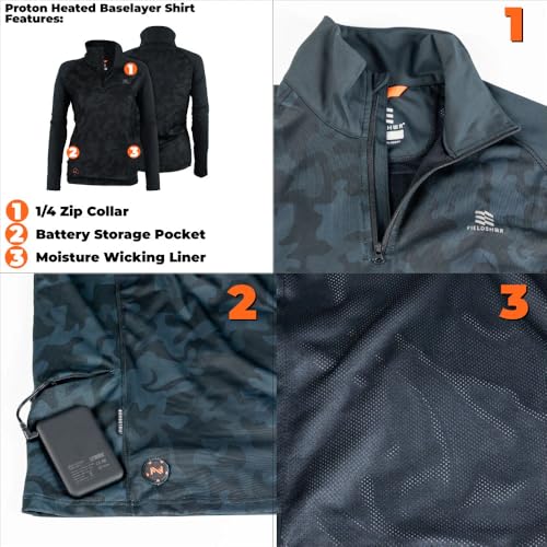 Fieldsheer’s women’s Proton Heated Baselayer Shirt is an all-season favorite designed to be worn under a sweater, snow jacket, or other outdoor gear, with a sporty silhouette that allows it to be worn on its own. Powered by Powersheer, the 7.4-Volt Lithium-Ion battery holds up to ten hours of power per charge delivering comfort no matter what nature throws at you and with a universal USB charging port. The subtle camouflage design adds a level of detail and sophistication to the front and back, while a 3/4 zip keeps the Proton Heated Baselayer Shirt securely in place. Integrated with our Technology, simply activate one of four heat settings with our proprietary Bluetooth integrated MW Connect app. The Sweatsheer liner draws moisture away from the body, providing lasting comfort without sacrificing mobility. The poly fabric blend offers mobility, comfort and performance, keeping you in the field and doing what you love longer.