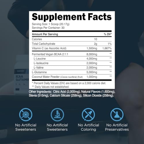 Comprehensive Workout Support: Designed for pre-, intra-, and post-workout use, our BCAA powder includes 5,000 mg of L-glutamine, 1,500 mg of vitamin C, and 1,000 mg of coconut water powder. This synergistic formula promotes hydration, supports immune function, and decreases muscle damage, ensuring you stay at the top of your game.