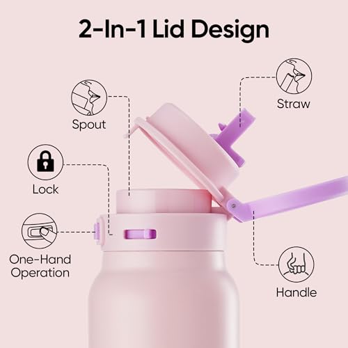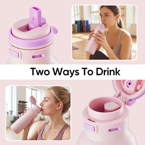 Fijinhom 24 oz Insulated Water Bottle, 2-in-1 Stainless Steel with Straw and Spout, Leak Proof, 304 Stainless Steel with Wide Mouth, Double Wall Vacuum for Outdoors, Sports, Travel, Work (Pink)