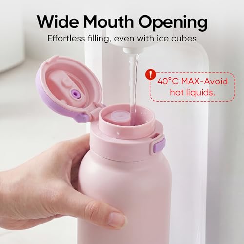 【WIDE MOUTH FOR EASY CLEANING & ICE CUBES】The wide mouth design allows for effortless filling with ice cubes, fruit infusions, or electrolyte powders. Plus, it’s easy to clean by hand or with a bottle brush, making it a reliable stainless steel water bottle for daily use at work, home, or on outdoor adventures.