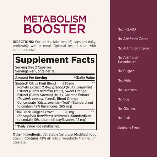Specification: Nature’s Bounty Optimal Solutions Metabolism Booster Supplement, Boosts Fat Metabolism, Promotes Abdominal Fat Loss, With Citrus Extracts and Black Ginger, 60 Capsules