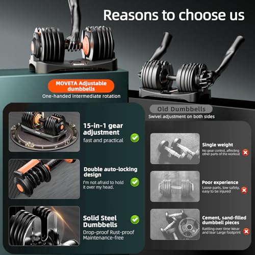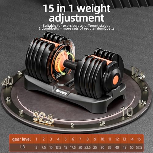 【15 in 1 weight adjustment】You will receive a pair of 52.5 lb dumbbells, each adjustable in 15 different weights: 5/7.5/10/12.5/15/17.5/20/22.5/25/30/35/40/45/50/52.5 lbs, Suitable for people at different stages of exercise, 2 dumbbells = more sets of ordinary dumbbells, say goodbye to dumbbells piled up all over the room