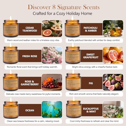 Premium Scents & Elegant Amber Jars:Includes 8 popular fragrances: Cedar Teakwood, Patchouli & Amber, Fresh Rose, Sweet Grapefruit, Rose & Garnetberry, Fig, Ocean, and Eucalyptus & Mint. Each candle is housed in an amber glass jar that adds a warm, cozy glow to any home decor.