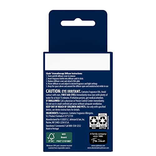 Set the mood with this Glade Aromatherapy Cool Mist Diffuser Refill. Breathe in with this dual blend of essential oil-infused fragrance and enjoy the Find Clarity scent. This home diffuser refill uses fragrance infused with essential oils that are traced to their countries of origin. Own the mood with the blend of Italian Bergamot and Guatemalan Lemongrass. Glade mist refills are crafted for a life in balance, and they’re made without parabens, phthalates, nitro musks, artificial colors or dyes. Our scent diffuser refill is a treat for your senses. When used with the Glade Aromatherapy Cool Mist Diffuser, it helps to set a relaxing tone. Match your light and fragrance mist settings to suit any mood. Play with different color options and brightness and fragrance levels. Just tap to change the mood with the easy-to-use controls. There’s no mixing or mess, as these one-click air diffuser refills are preblended and simple to insert into the device, while dual-wick technology ensures consistent performance for up to 60 days*. The aromatherapy home diffuser for this refill fits all USB power outlets including power banks and laptops so you can connect to your mood wherever you want. Inspire mindfulness with Glade air freshener and take time to relax and unwind. *on low setting