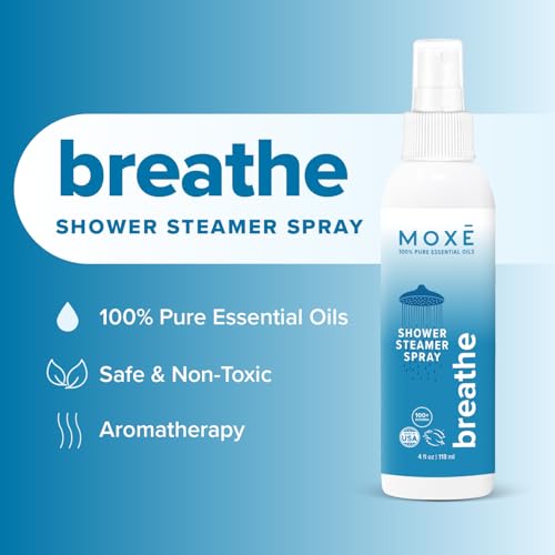 MOXE Breathe Shower Mist, Eucalyptus and Peppermint, Spa Steam Spray, Certified Natural 100% Essential Oils, Made in USA, Aromatherapy, Sinus Congestion Relief, Tension Relief, 4 Ounces (1 Pack)