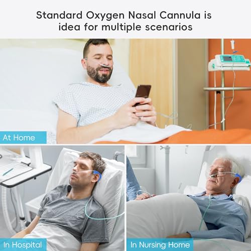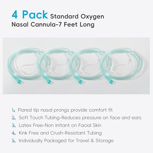 ” Individually Packaged: Each nasal cannula comes in a 7-foot lightweight oxygen tubing and is individually packaged to ensure cleanliness before use. It also features a soft green design to increase visibility and avoid trips and falls.”